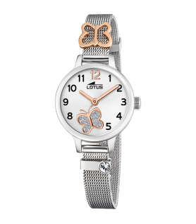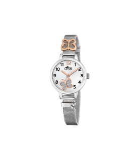 79,00 €Reloj Lotus Niña 18659/2. Es un reloj analógico, con maquinaria de cuarzo con números arábigos en negro y el numero 12 en rosé, como las agujas. Alimentación a pila. La esfera en color plateado y el brazalete en acero con malla milanesa con detalle de mariposa en rosé.