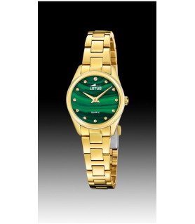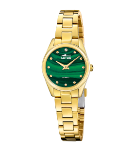 129,00 €Reloj Lotus colección Old Money 19007/3, analógico para mujer con movimiento de cuarzo, 2 agujas y brazalete de acero con baño de oro amarillo de tipo armys, con cierre desplegable con pulsadores. La esfera es de color verde. Tiene una resistencia al agua de 50 metros.