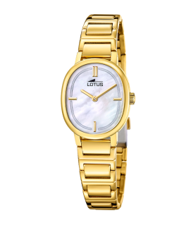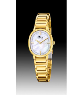 129,00 €Reloj Lotus colección Old Money 19013/1, analógico para mujer con movimiento de cuarzo, 2 agujas, caja ovalada y brazalete de acero dorado de tipo armys, con cierre desplegable con pulsadores. La esfera es de nácar. Tiene una resistencia al agua de 50 metros.