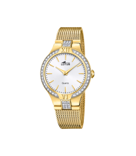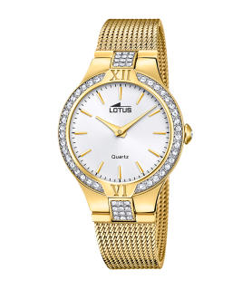 149,00 €Reloj Lotus Bliss 18895/1, analógico para mujer, con movimiento de cuarzo, 2 agujas. Caja de acero dorado, al igual que el brazalete de acero de tipo malla milanesa, con cierre deslizante. La esfera es en color plateado. Tiene una resistencia al agua de 50 metros.