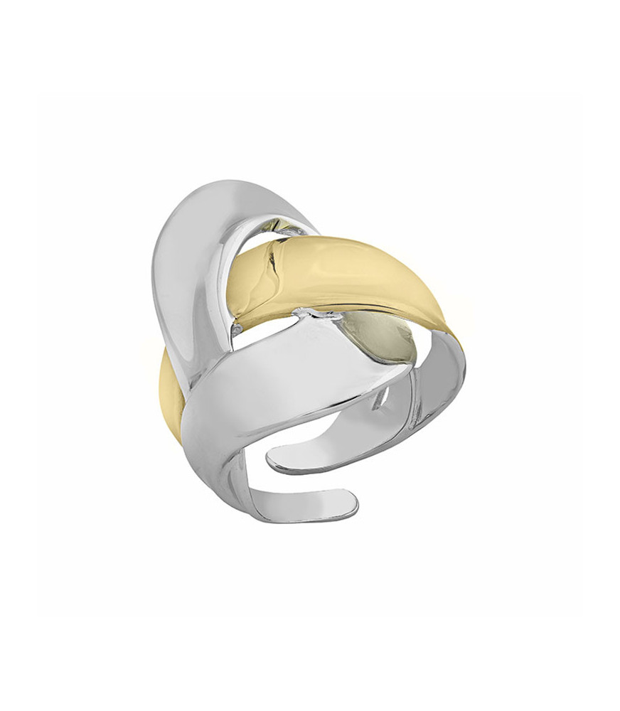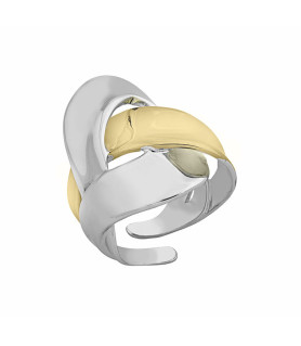 Anillo de Jorge Revilla A121-9745OM16, bicolor, en plata de ley de 925 milésimas con baño de oro amarillo de 18 quilates y en plata de ley de 925 milésimas con baño de rodio satinado, acabado en brillo, con aro entrelazados y abierto por la parte de abajo.