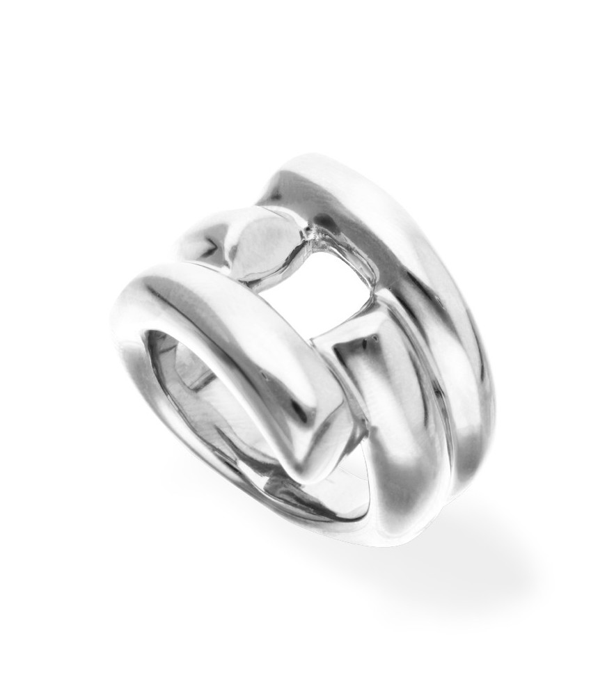 Anillo Raíces UNOde50 ANI0863MTL0001, con cuatro formas orgánicas entrelazadas que evocan la conexión con tus raíces y hecho de metal bañado en plata.