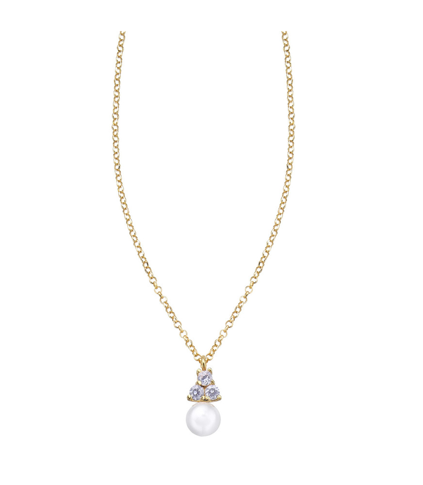 Colgante Mi primera joya, de Duran Exquse 00513064, en plata de ley 925 milésimas con baño de oro amarillo, con motivo en la parte superior con 3 circonitas y con perla natural.