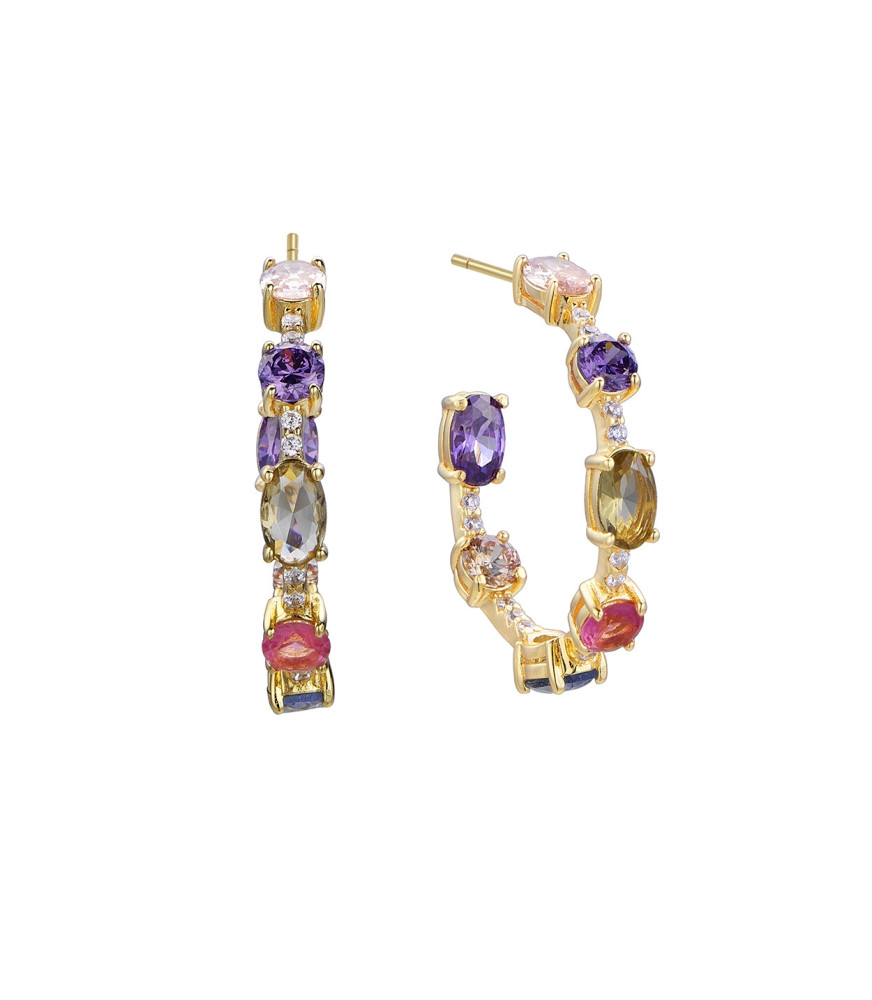 Pendientes Armonia de colores, de Duran Exquse 00513149, de tipo aro, oversizes, en plata de ley 925 milésimas con baño de oro amarillo, con cuarzos de colores y circonitas transparentes.
