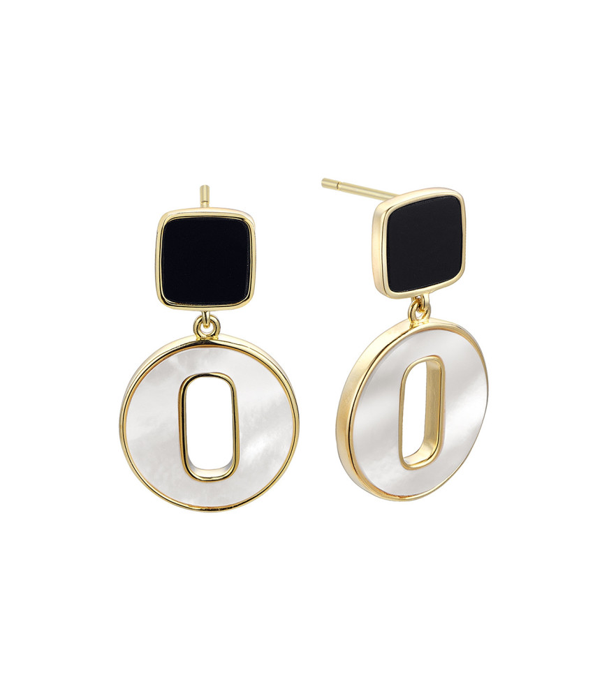 Pendientes M.O.P. de Duran Exquse 00513208, en plata de ley 925 milésimas con baño de oro amarillo, largos, con con onix y madreperla colgando.