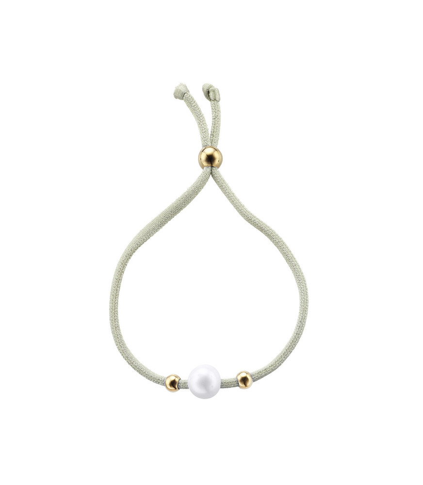 Pulsera Pantone de Duran Exquse 00513283, con elástico en color verde pastel, detalles en plata de ley 925 milésimas con baño de oro amarillo y una perla en la parte central.