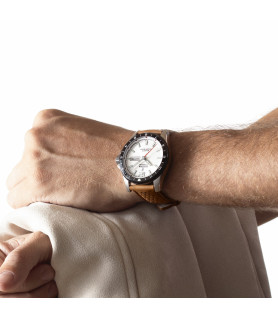 Reloj Festina Titanium F20699/1, para hombre, analógico, con movimiento de cuarzo, 3 agujas y doble calendario. La esfera es en color plateado, con bisel giratorio en color negro, con índices como indicadores de las horas en color plateado y luminiscentes, al igual que las agujas, a excepción del segundero que es en color rojo y con cristal mineral. Brazalete de piel en color camel con cierre de hebilla. Tiene una resistencia al agua de 100 metros.