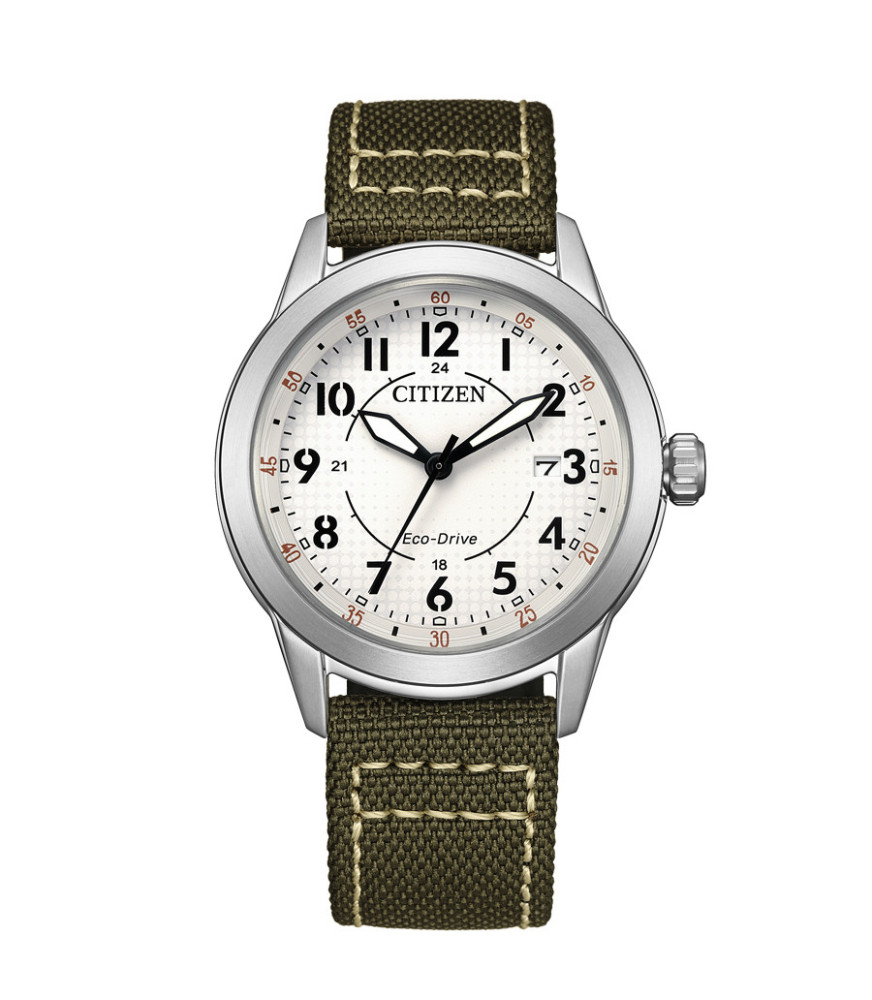 La caja que contiene el mecanismo es de acero antialérgico e inoxidable con acabado matizado, mide 40 mm de diametro y un grosor de 10.4 mm. Un cristal de mineral cubre la esfera, la cual es de color blanco. Los marcadores horarios son número arábigos en color negro y agujas luminiscentes. Mientras, la correa es de nylon en color verde militar, pespunteada en color blanco. Tiene una resistencia al agua de 10 ATM.