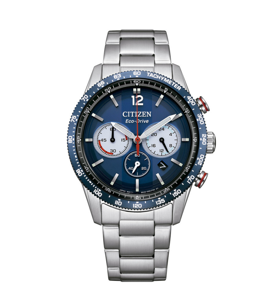 Reloj Citizen Chrono Racing Eco-Drive Hombre CA4716-50L. Se trata de un reloj original de la marca Citizen, para hombre. Es un modelo analógico de tres agujas, cronógrafo y calendario entre las 4 y las 5 horas. Tiene un mecanismo que funciona con un mecanismo ecológico de energía solar, llamado Eco-Drive, no requiere pila convencional (con reserva de carga 9 meses).