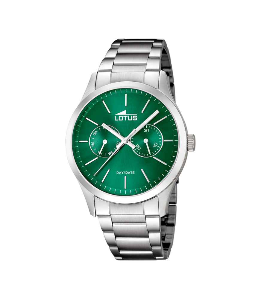 Reloj Lotus Minimalist Hombre 15954/E. Es un reloj analógico, con maquinaria de cuarzo, 3 agujas, multifunción, con índices en color plateado y agujas luminiscentes, al mismo tono. Alimentación a pila. La esfera en color verde y brazalete de acero con cierre desplegable con pulsadores.
