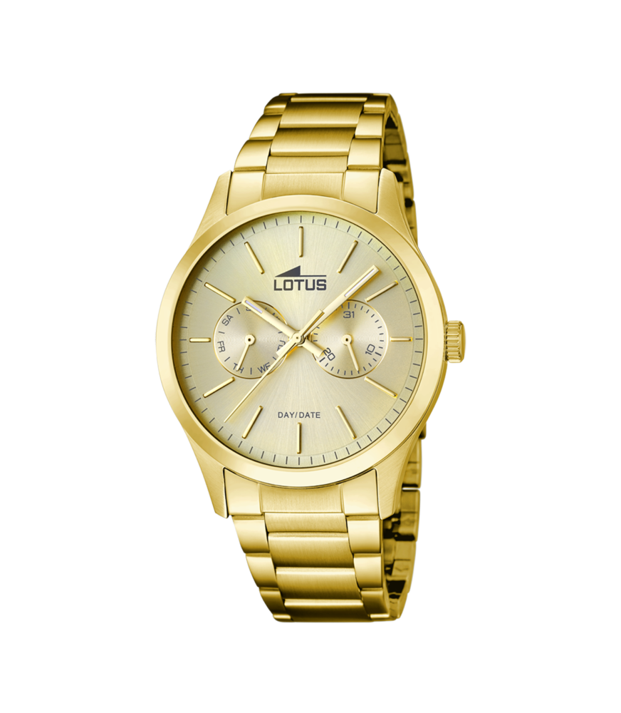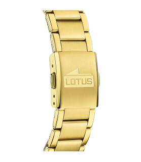 Reloj Lotus Minimalist Hombre 15955/2. Es un reloj analógico, con maquinaria de cuarzo, 3 agujas, multifunción, con índices en color dorado y agujas luminiscentes, al mismo tono. Alimentación a pilas. La esfera en color dorado, de 42 mm de diámetro, con bisel liso en acero dorado, igual que la caja. Brazalete en acero dorado con cierre desplegable con pulsadores. La resistencia al agua es de 50 metros (5 ATM).