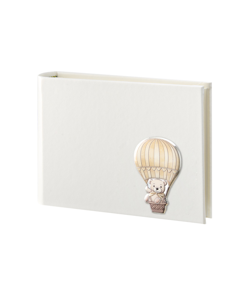 Álbum de color blanco, con detalle de metal plateado con detalle de un oso en un globo aerostático, con esmalte de color.