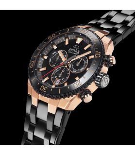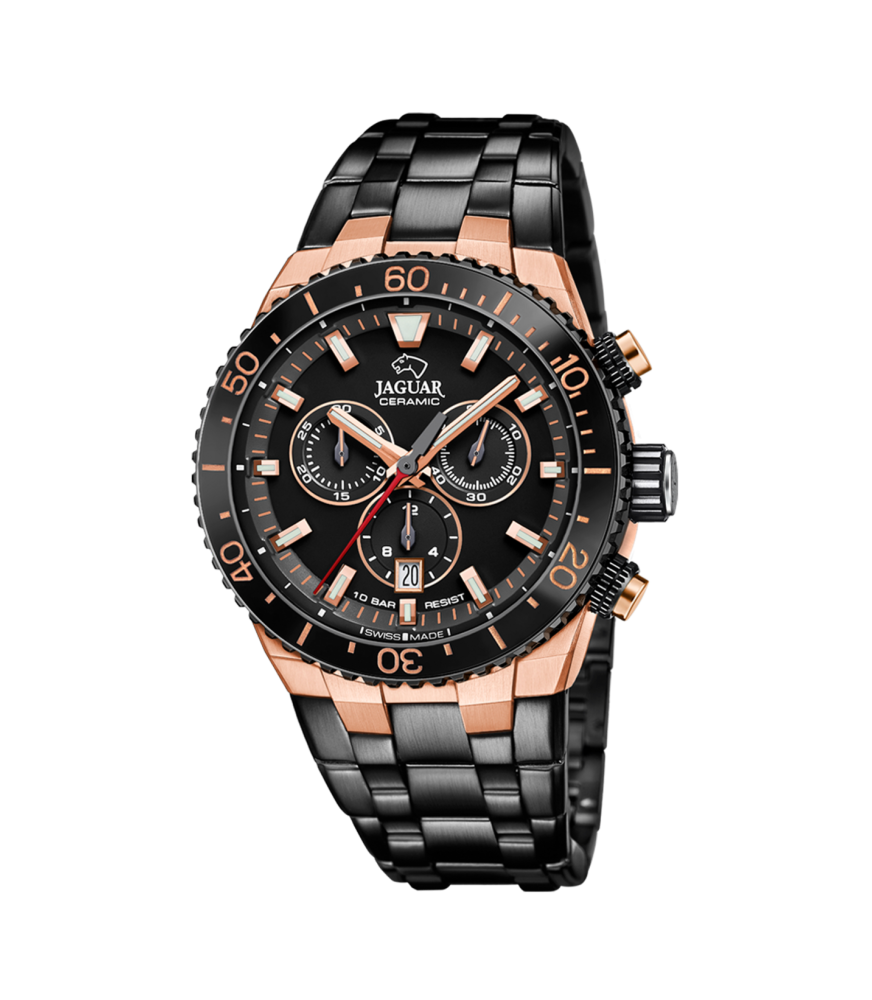 Reloj Jaguar Ceramic Negro J1023/1, analógico para hombre, con movimiento de cuarzo Suizo, 3 agujas, cronógrafo y calendario. La caja que contiene el mecanismo es de acero en color rosado, con bisel en color negro, mide 44.8 milímetros de diámetro y 12.65 mm de grosor. Los marcadores de las horas son índices en color rosado y luminiscentes. Un cristal de zafiro protege a la esfera, la cual es en color negro. Mientras, el brazalete es de acero en color negro, con cierre desplegable con tapa de seguridad. Es sumergible a 100 metros.