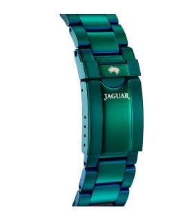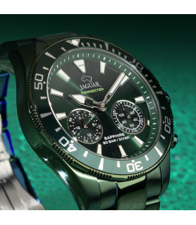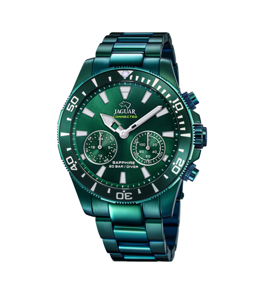 Reloj Jaguar Connected J990/1, para hombre, con funciones inteligentes y 3 agujas La caja que contiene el mecanismo es de acero en color verde, con bisel, al mismo tono de la caja, mide 45.7 milímetros de diámetro y 13.98 mm de grosor. Los marcadores de las horas son índices en color blanco y luminiscentes. Un cristal de zafiro protege a la esfera, la cual es en color verde. Mientras, el brazalete es de acero en color verde, con cierre desplegable con tapa de seguridad. Es sumergible a 200 metros.