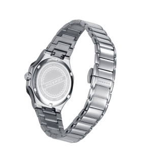 Con una caja en forma octogonal, de acero extraplana que incorpora un doble bisel en IP gris antracita, este modelo destaca por su diseño refinado y su resistencia de hasta 10 atm. Su esfera gris antracita, se complementa armoniosamente con índices y agujas en tono IP rosa, creando un contraste delicado y femenino. El cristal de zafiro añade un toque de durabilidad y brillo, mientras que el brazalete de acero asegura un ajuste cómodo y seguro. Además, cuenta con un práctico calendario a las 6 que aporta funcionalidad sin sacrificar estilo.