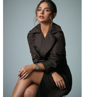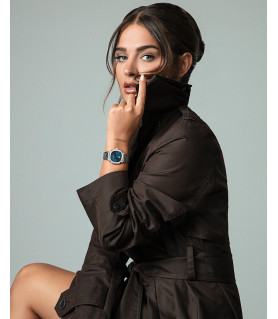 Con una caja en forma octogonal, de acero extraplana que incorpora un doble bisel en plateado, este modelo destaca por su diseño refinado y su resistencia de hasta 10 atm. Su esfera azul se complementa armoniosamente con índices y agujas en tono IP plateado, creando un contraste delicado y femenino. El cristal de zafiro añade un toque de durabilidad y brillo, mientras que el brazalete de acero asegura un ajuste cómodo y seguro. Además, cuenta con un práctico calendario a las 6 que aporta funcionalidad sin sacrificar estilo.