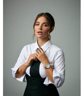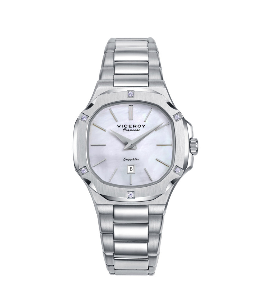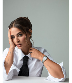 Su diseño se caracteriza por una caja en forma octogonal, de acero extraplana que incorpora un bisel en acero Ip con diamantes creados. La esfera es en tono madre perla, con índices, agujas en Ip plateados y calendario a las 6 horas. El cristal de zafiro proporciona durabilidad y protección, asegurando una claridad impecable. El brazalete de acero añade un toque clásico, garantizando un ajuste cómodo y seguro para cualquier ocasión. Sumergible 10 ATM.