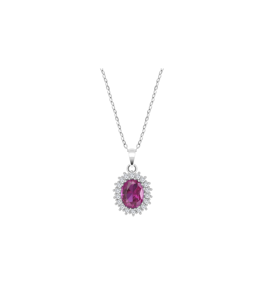 Collar Lotus Silver LP3459-1/4 en plata de ley rodiada, con un colgante con una circonita central en color rubi de 7 x 9 mm y 18 circonitas alrededor de la circonita central en color blanco de 1.6 mm.