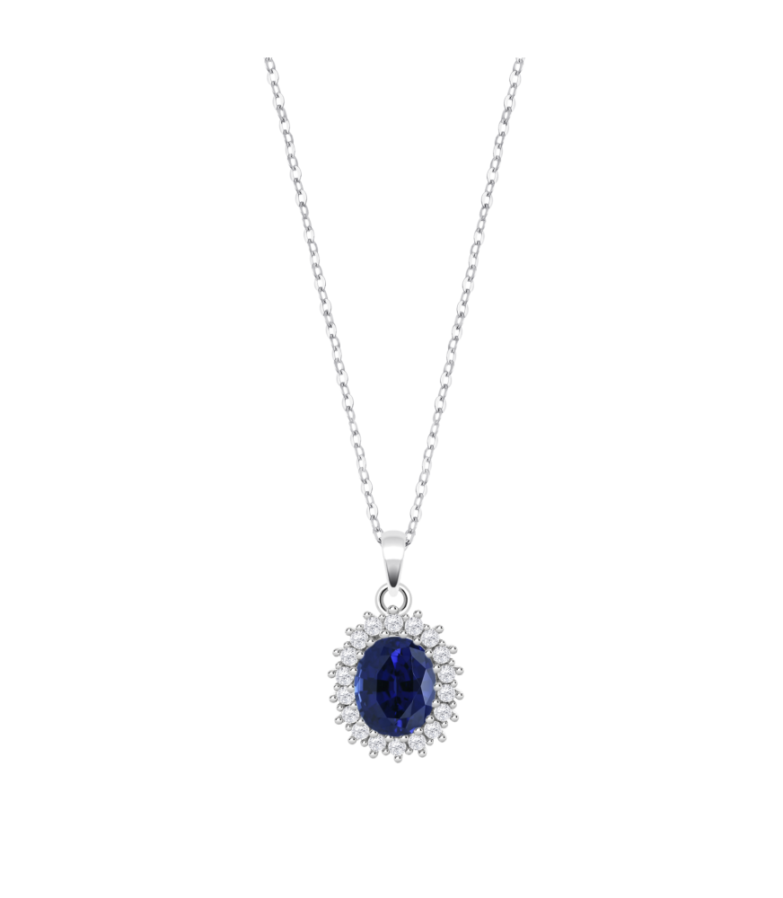 Collar Lotus Silver LP3459-1/1, en plata de ley rodiada, con un colgante con una circonita central en color zafiro de 7 x 9 mm y 18 circonitas alrededor de la circonita central en color blanco de 1.6 mm.
