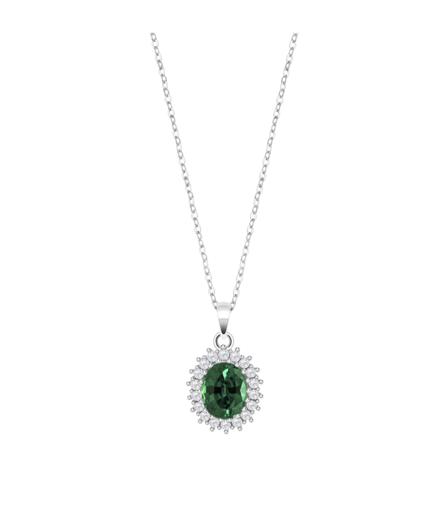 Collar Lotus Silver LP3459-1/3, en plata de ley rodiada, con un colgante con una circonita central en color esmeralda de 7 x 9 mm y 18 circonitas alrededor de la circonita central en color blanco de 1.6 mm.