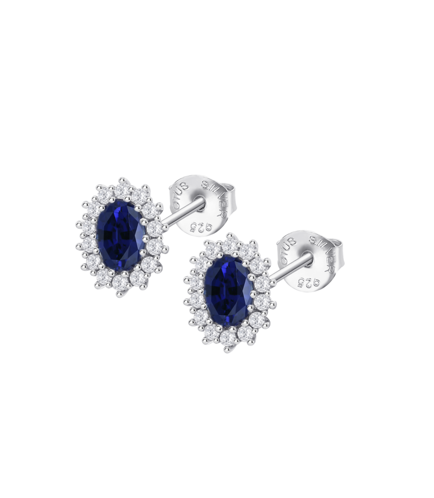 Pendientes Lotus Silver LP3459-4/1, en plata de ley rodiada, con una circonita central en color zafiro de 5 x 7 mm y 14 circonitas alrededor de la circonita central en color blanco de 1.6 mm en cada pendiente.