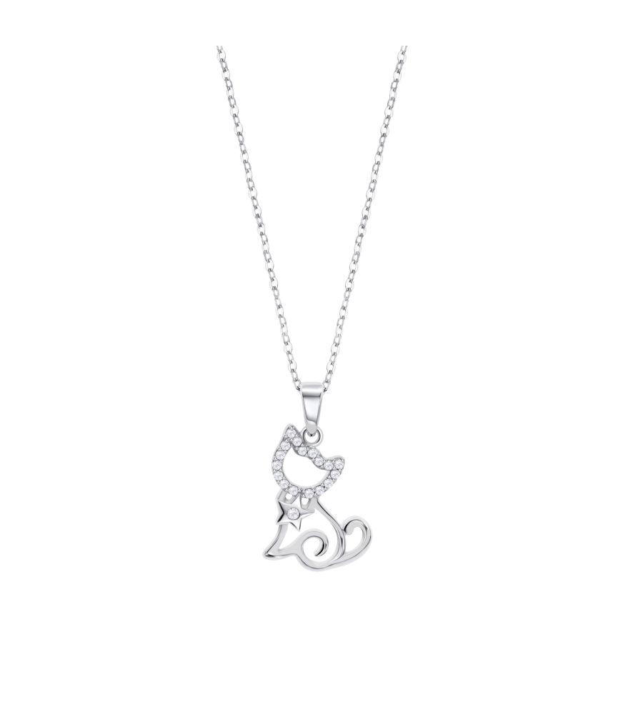 Collar Lotus Silver LP3873-1/1, en plata de ley rodiada, con un motivo colgando en forma de gato con circonitas blancas engastadas en la parte de la cabeza.