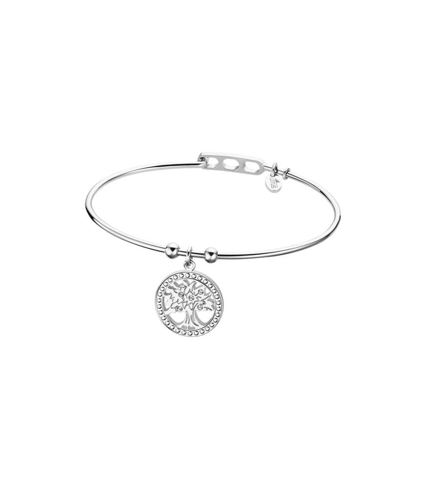 Pulsera Lotus Style LS2015/2/3, rigida, en acero inoxidable 316L y circonitas engastadas en el detalle de las hojas del árbol, el cierre es de tipo pulsador.