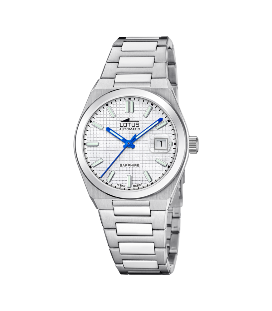 Reloj Lotus colección Automatic 18999/1, analógico, para hombre, 3 agujas y calendario. La esfera es en color negro. Brazalete de acero, tipo armys, con cierre desplegable con pulsadores. Tiene una resistencia al agua de 100 metros.
