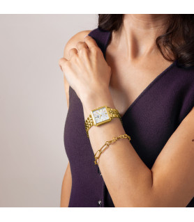 La caja que contiene el mecanismo es de acero en color dorado, cuadrada, con bisel liso, al mismo color, mide 26 milímetros de diámetro. Los marcadores de las horas son ínidces en color dorado, como las agujas. Un cristal mineral protege a la esfera, la cual es de nacar. Mientras, el brazalete es de acero en color dorado, de tipo armys, con cierre desplegable. Es sumergible a 50 metros (5 ATM).