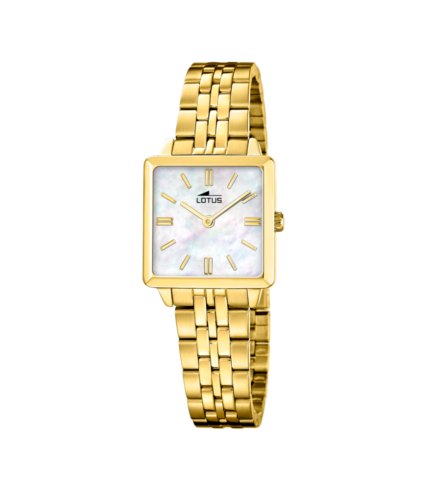 Reloj Lotus 2gether 19011/1, analógico para mujer, con movimiento de cuarzo y 2 agujas. La esfera es de nacar y la caja en acero en color dorado, al mismo tono que el brazalete. Brazalete de acero de tipo armys con cierre desplegable. Tiene una resistencia al agua de 50 metros.
