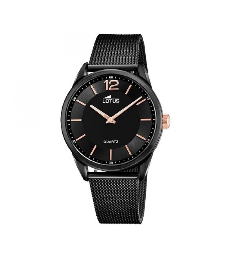 Reloj Lotus Minimalist 18736/B, analógico, para hombre con movimiento de cuarzo, 2 agujas y brazalete de acero en color negro, de malla milanesa, con cierre de deslizante. La esfera es en color negro y la caja en acero al mismo tono que el brazalete en negro. Tiene una resistencia al agua de 100 metros.