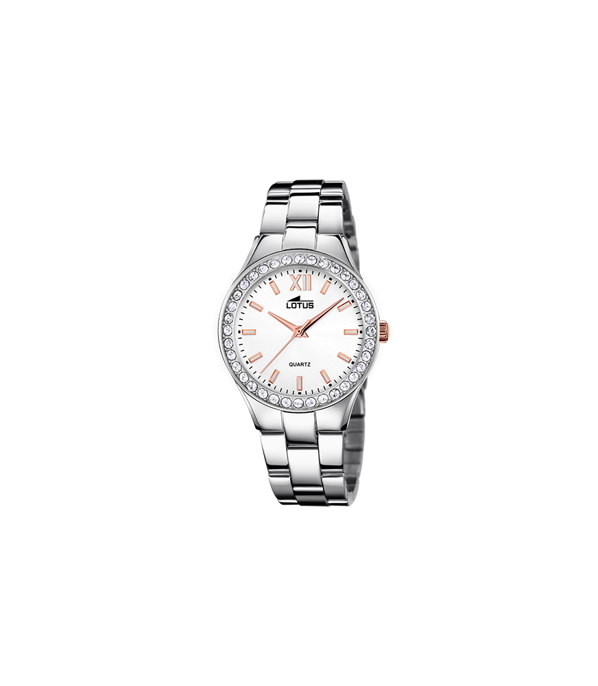 Reloj Lotus colección Bliss 18883/1, analógico para mujer con movimiento de cuarzo, 3 agujas y brazalete de acero de tipo armys, con cierre desplegable con pulsadores. La esfera es en color plateada. Tiene una resistencia al agua de 50 metros.