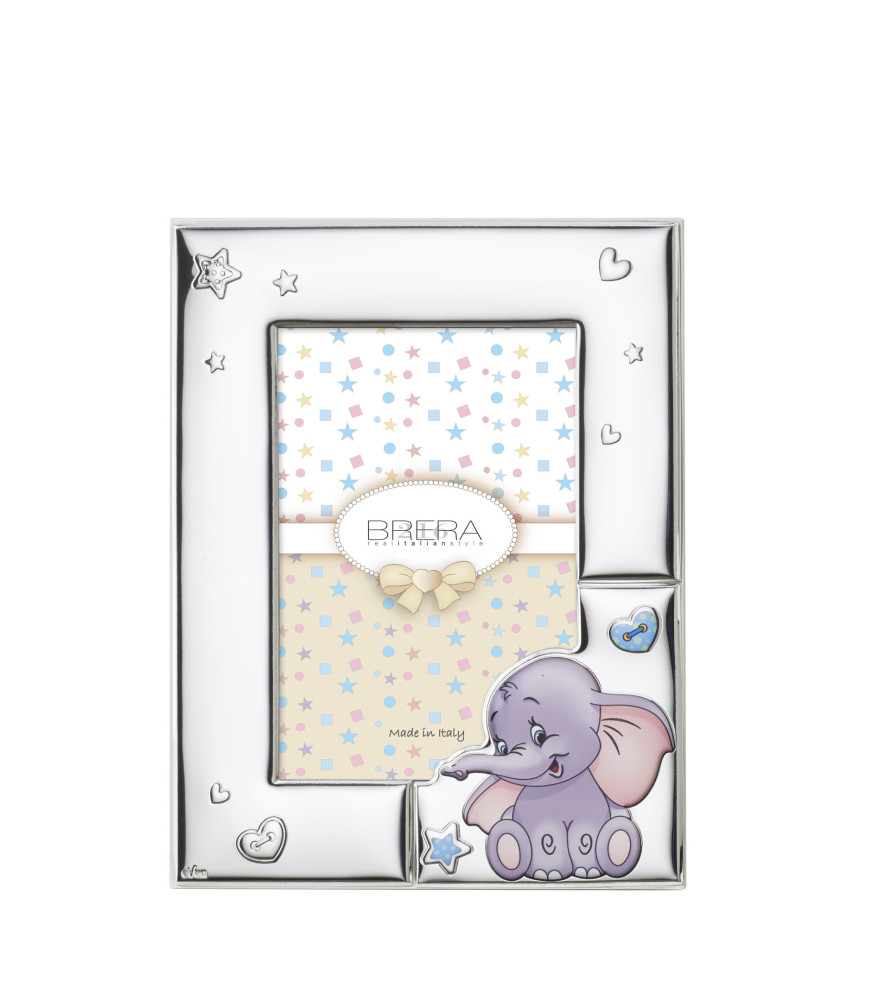 Marco de metal plateado con una figurita de un elefante sentado, base en madera de color azul celeste o rosa.