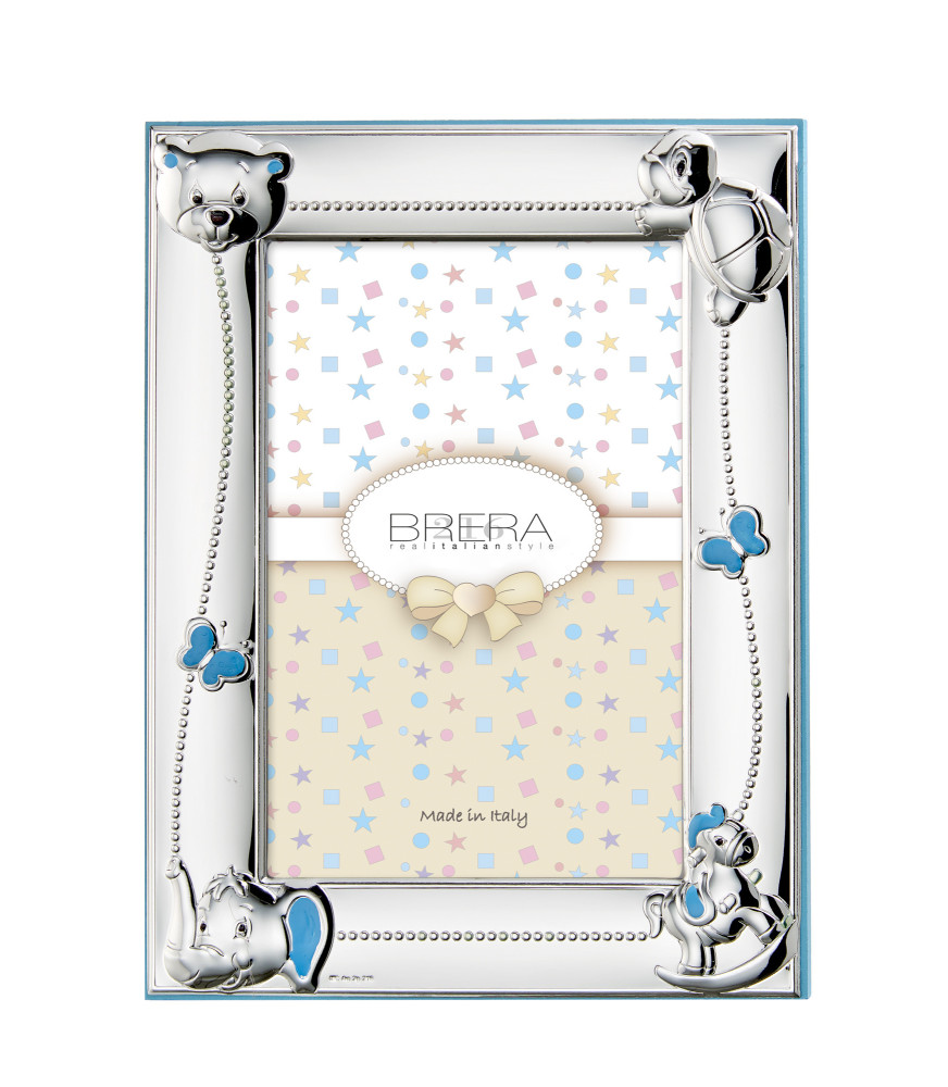 Marco de plata bilaminada en plata de 925 milésimas con varias figuritas en las esquinas del marco: la cabeza de un oso, una tortuga, la cabeza de un elefante y un caballo con una mecedora, base en madera de color celeste o rosa.