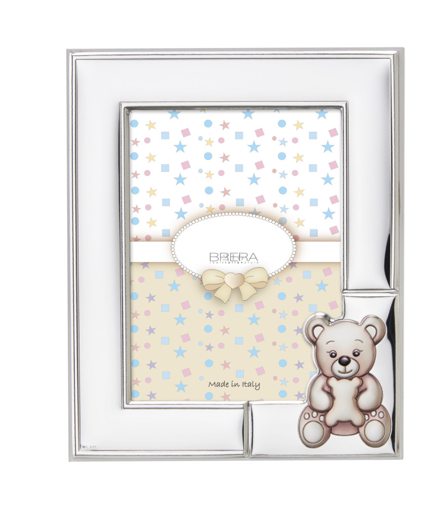 Marco de metal plateado con una figurita de un oso mama abrazando a otro osito, base en madera de color blanco.