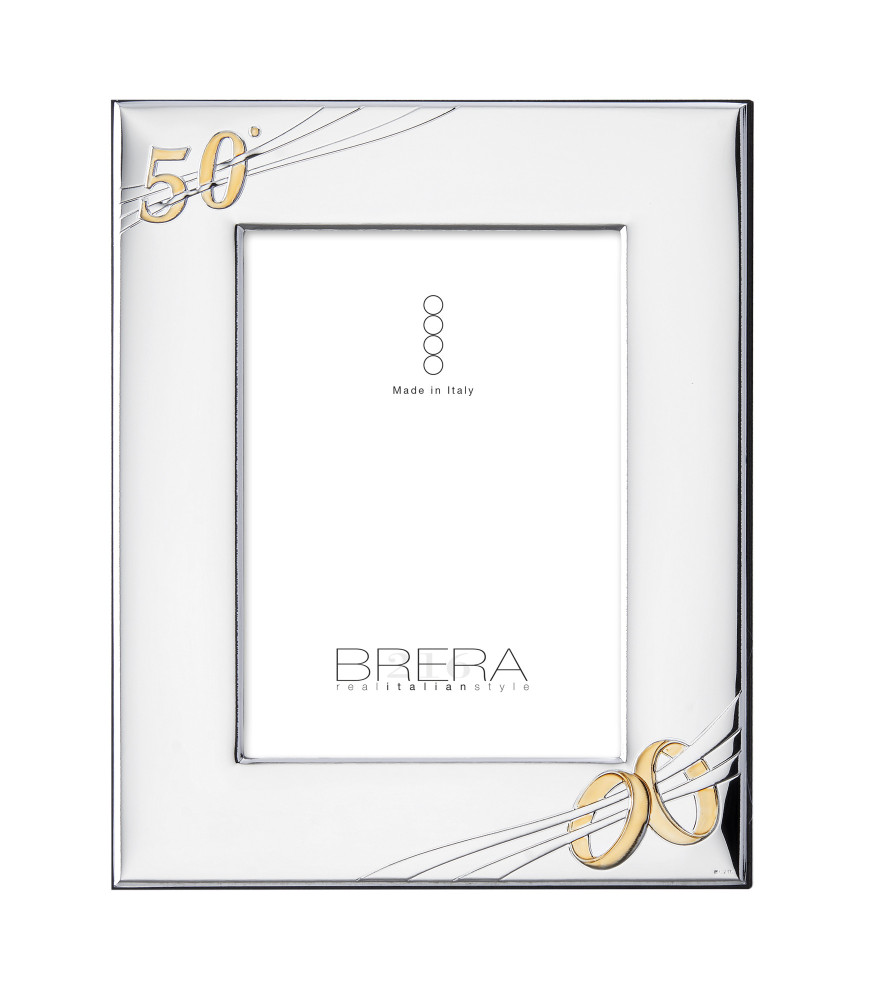 Marco de metal plateado con acabado liso brillo, detalle de aros de boda y 50 Aniversario en dorado, la parte posterior es madera tono wengue.