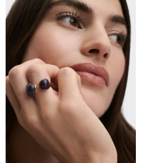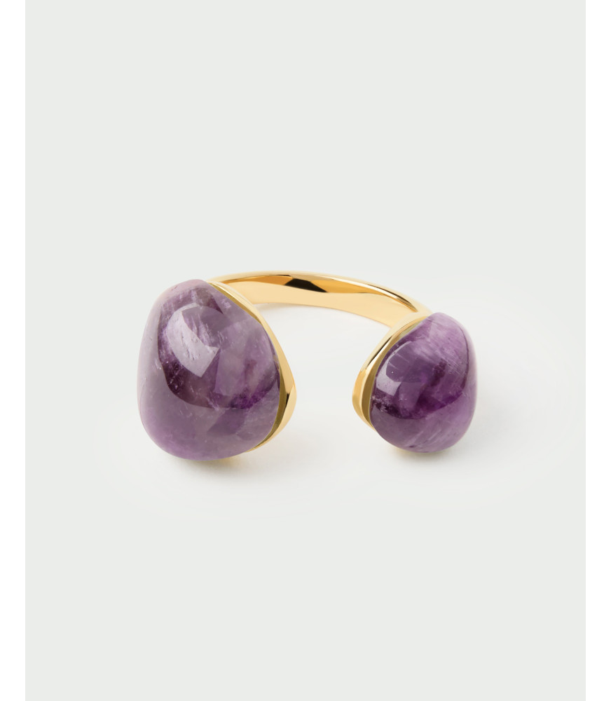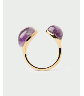 Anillo Amatista Gravity, P D Paola, COLECCIÓN DOLPHIN, fabricado en plata de ley 925 milésimas con baño de oro de 18K, anillo abierto escultural adornado con dos piedras moradas fluidas.
