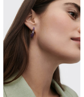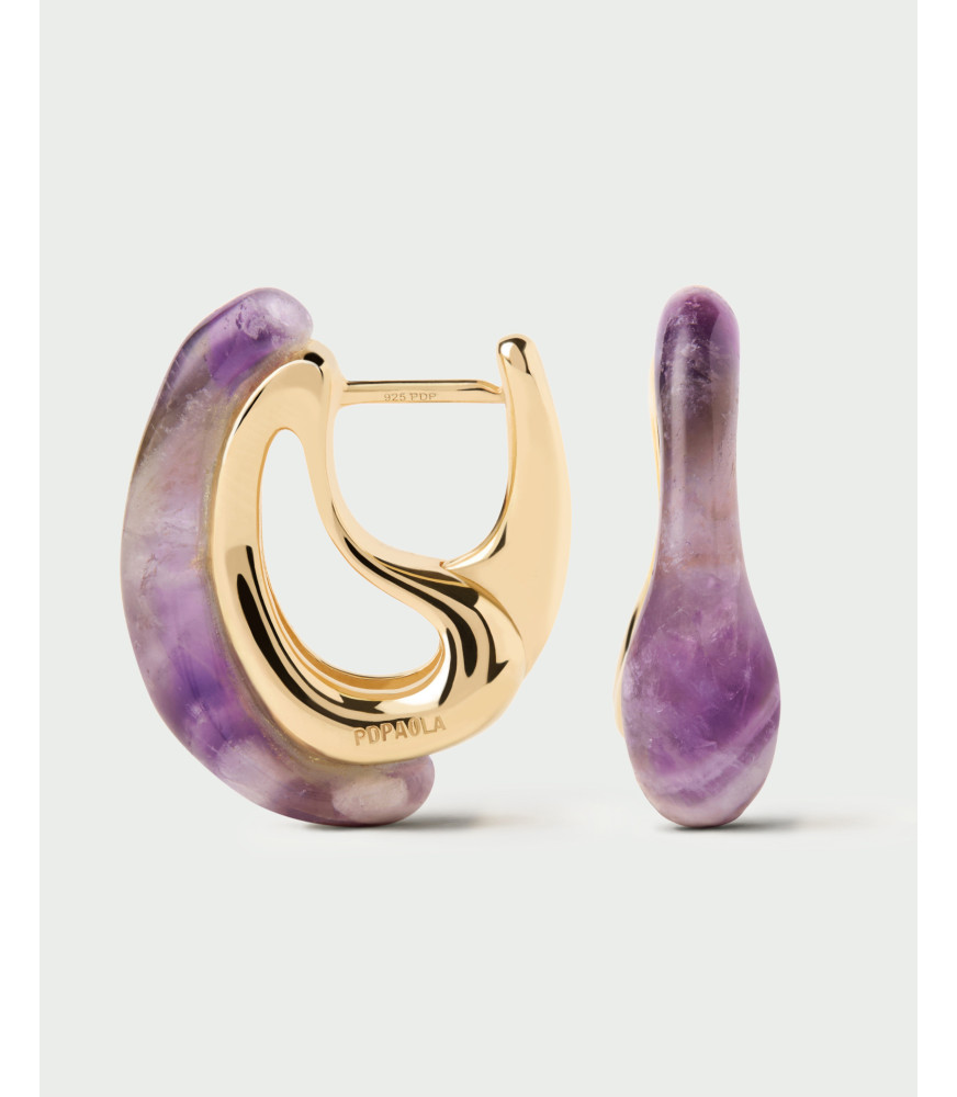Pendientes Amatista Brisa, P D Paola, COLECCIÓN DOLPHIN, fabricado en plata de ley 925 milésimas con baño de oro de 18K, de tipo aro, adornados con piedra morada (amatista) en forma de gota ondulada.