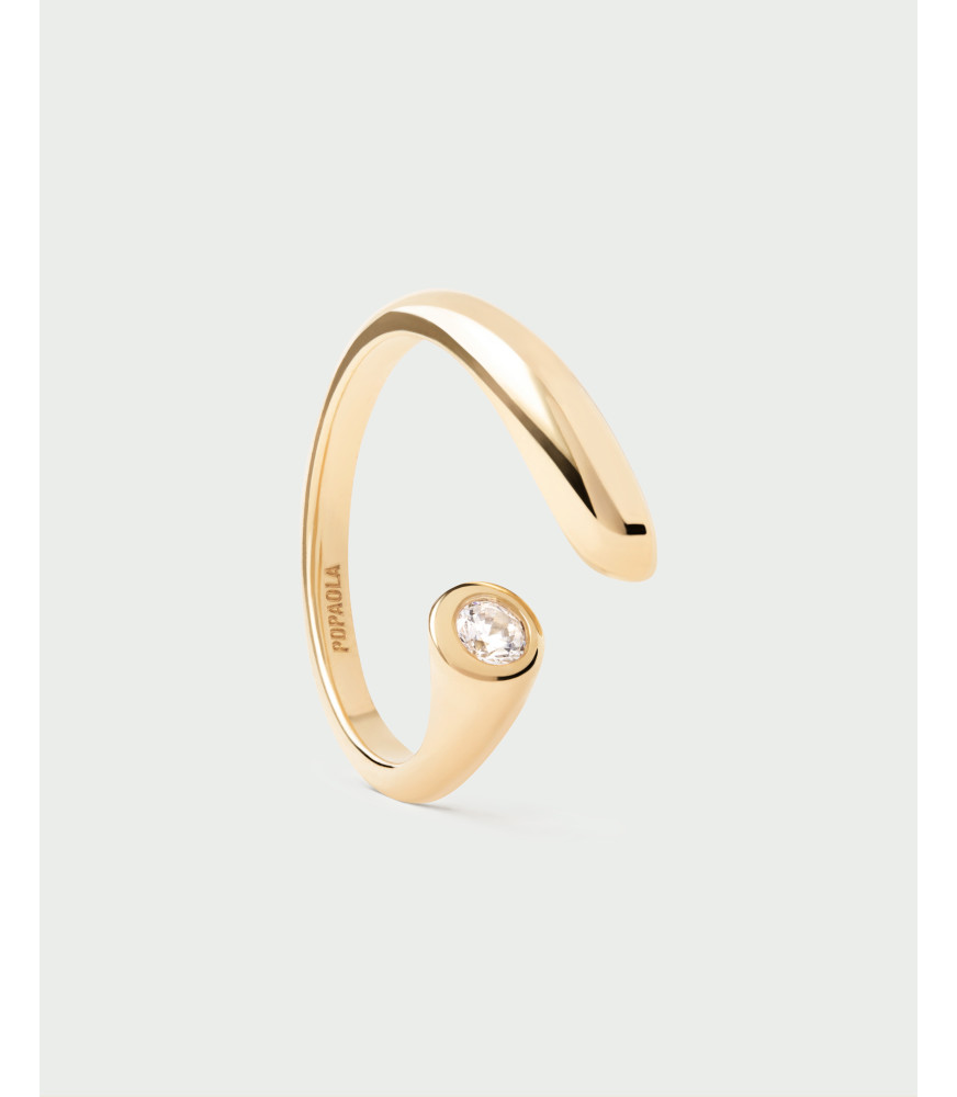 Anillo Caramelle, P D Paola, COLECCIÓN LA PERLA, fabricado en plata de ley 925 milésimas con baño de oro de 18K, anillo abierto elegante adornado con una circonita blanca y líneas fluidas.