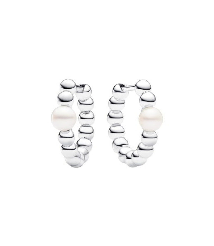 Pendientes de Aro en plata de primera ley Perla Cultivada de Agua Dulce Tratada y Esferas, cada aro se ha embellecido con una sola perla cultivada de agua dulce tratada ubicada en una fila de esferas metálicas pulidas. La perla central, es ligeramente más grande que las esferas y aporta al diseño un toque sofisticado y atemporal.