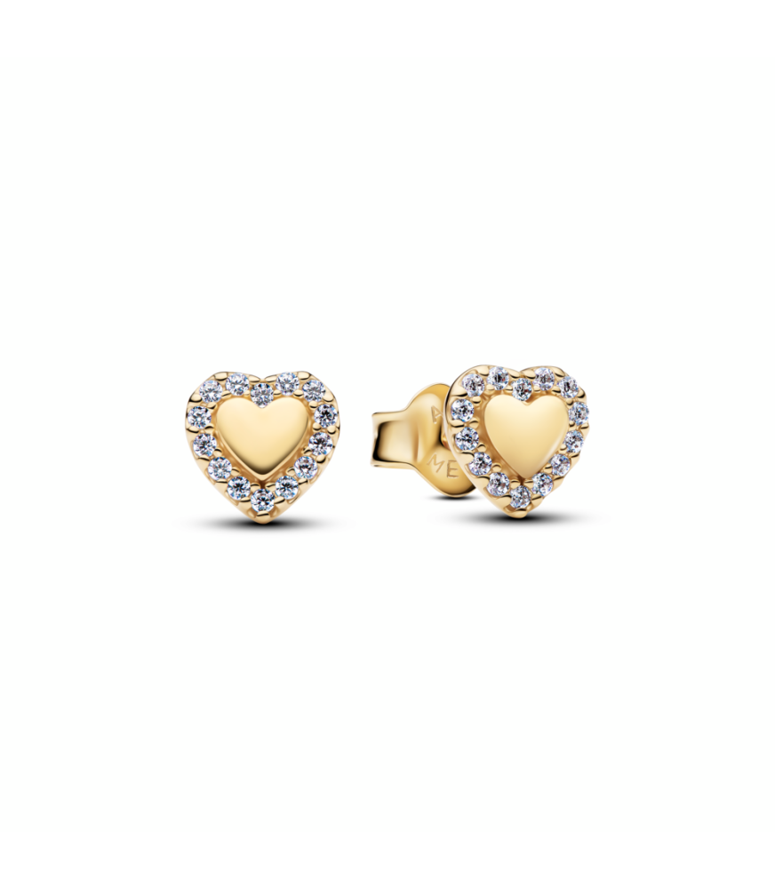 Pendientes de Botón Halo Corazón, con un recubrimiento en oro de 14k, se presentan con un corazón pulido rodeado de gemas brillantes. Se vende en par, para que puedas duplicar el amor.