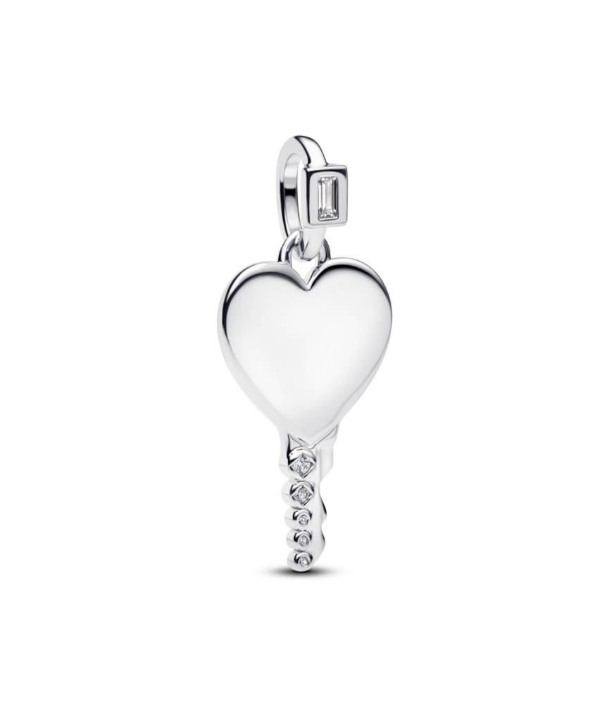 Colgante Etiqueta Grabable Llave Corazón, en plata de primera ley y presenta una llave cuya cabeza tiene forma de corazón y se puede grabar, mientras que el cuerpo se ha adornado con brillantes circonitas cúbicas y la anilla con gemas.
