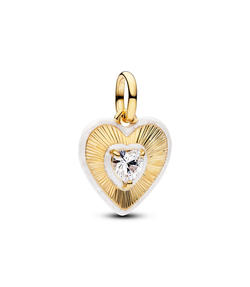 Charm Medallón Corazón Radiante Blanco, acabado a mano con un recubrimiento de oro de 14k, se ha adornado con una radiante circonita cúbica con forma de corazón enmarcada en brillante esmalte blanco en un diseño de doble cara que simboliza una actitud cálida y abierta.