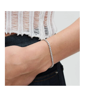 Pulsera de Tenis Brillante, en plata de primera ley, que se presenta con una llamativa fila de brillantes circonitas cúbicas transparentes sujetas con virolas cuadradas, aportará brillo a cualquier look.