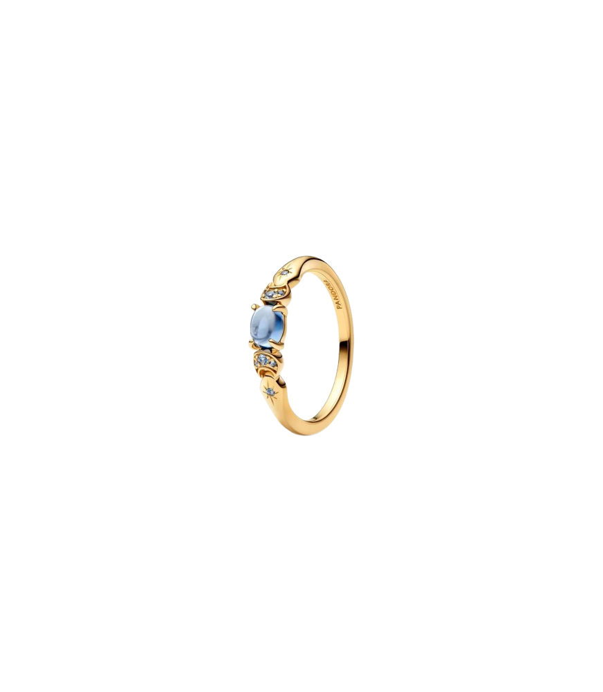 Anillo con un recubrimiento en oro de 14k Princesa Jasmine de Disney Aladdin, se presenta con una gema central de color azul claro de luna, brillantes lunas crecientes y estrellas, que celebran el valor, la autoestima y la magia de soñar a lo grande.