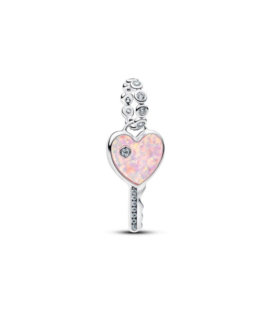 Charm colgante Llave Corazón Opalescente, doble, en plata de primera ley se presenta una llave con forma de corazón creada en plata de primera ley se ha adornado con un ópalo creado en laboratorio de color rosa, brillantes circonitas cúbicas y la inscripción "NO DUPLICATES" (No existen duplicados); un símbolo de un amor único.