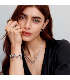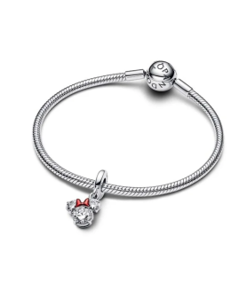 Charm Colgante en plata de ley Silueta de Minnie Mouse de Disney, que presenta tres brillantes gemas dispuestas de manera que crean la silueta de la cabeza de Minnie Mouse con su icónico lazo rojo en brillante esmalte.