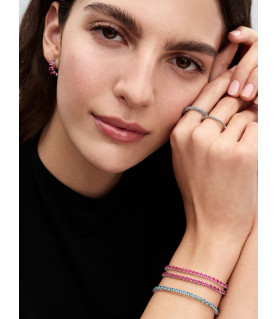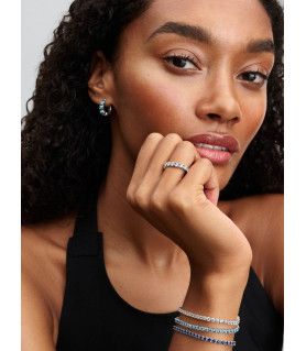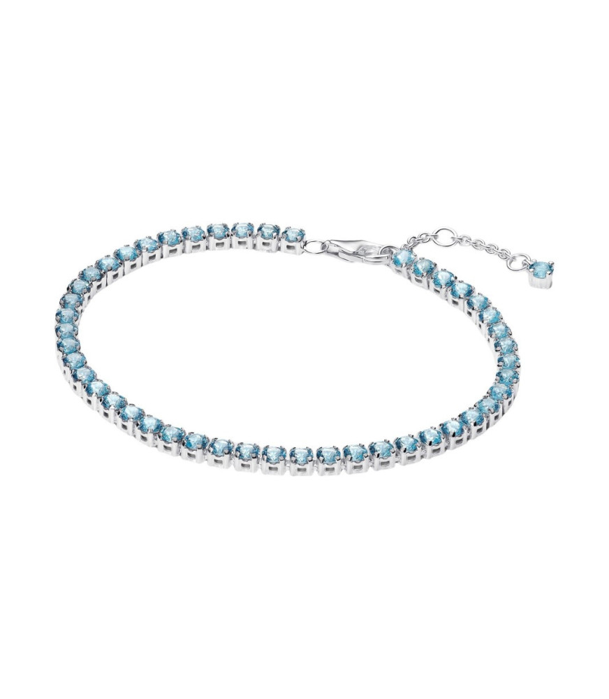 Pulsera Tenis en plata de ley Azul Claro Brillante, compuesta por cristales artificiales en color azul claro, que se presenta con una fila de gemas redondas y una gema más pequeña colgando del cierre.
