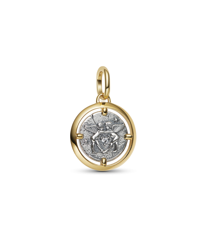 Charm Medallón Cupidos, con metales mezclados, en plata de primera ley y con un recubrimiento en oro de 14k, presenta el mensaje inscrito en latín «AMOR FATI», que significa «AMOR DEL DESTINO». Llévalo como recordatorio: lo que tenga que ser, será.
