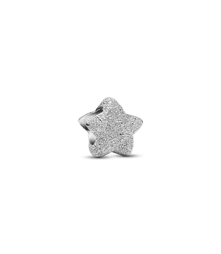 Charm mini Estrella Textura, en plata de ley presenta una textura de punta de diamante, un pequeño pero brillante recordatorio de que, incluso en la oscuridad, tu luz brilla con fuerza y marca el camino.